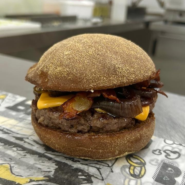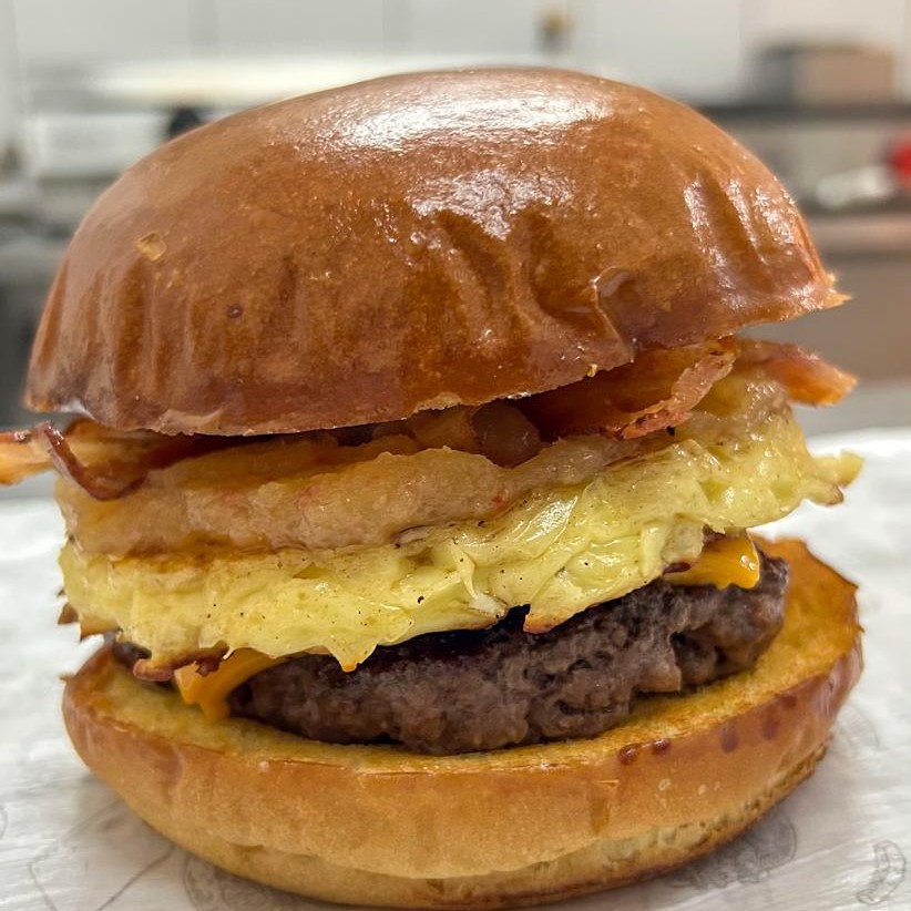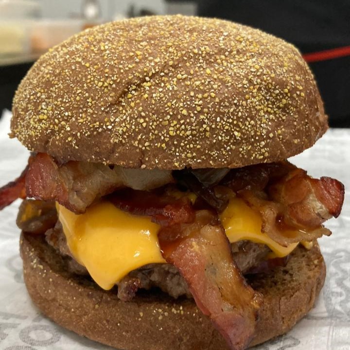 PÃO AUSTRALIANO, BURGER DE COSTELA (150 gr), QUEIJO CHEDDAR, CEBOLA CARAMELIZADA E FATIAS DE BACON