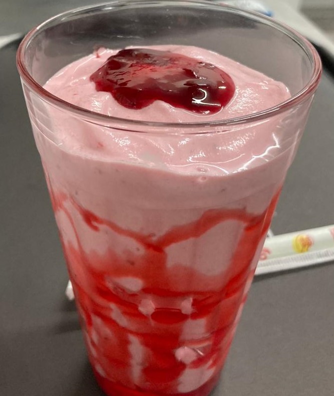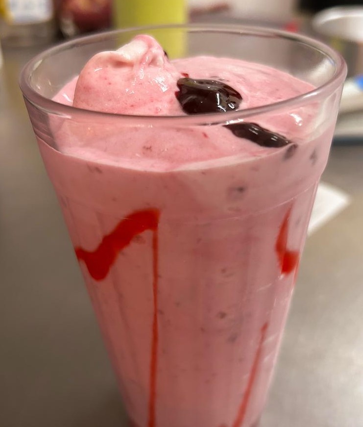 DELICIOSO MILKSHAKE FEITO COM CREME AMERICANO E CALDA COM PEDAÇOS DE FRUTAS VERMELHAS