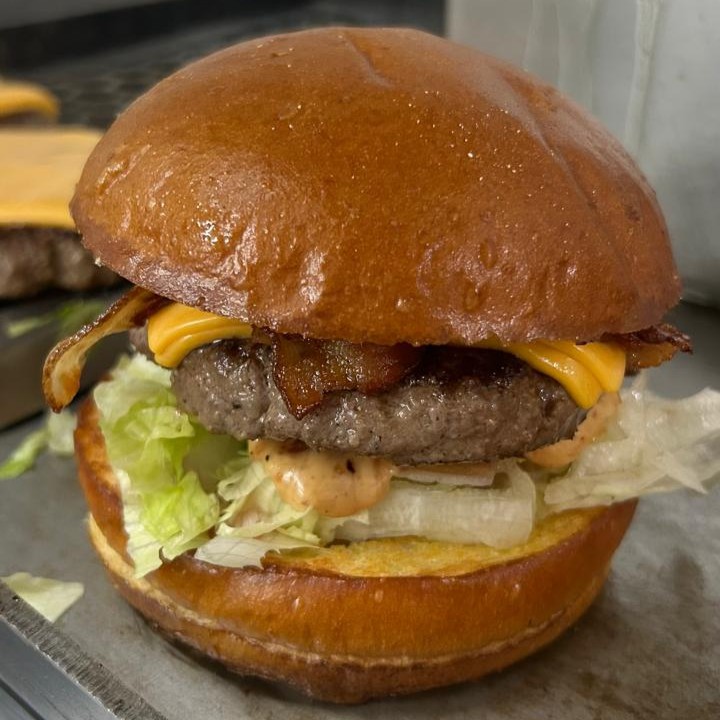 PÃO BRIOHE, BURGER TRADICIONAL (150 gr), QUEIJO CHEDDAR, ALFACE AMERICANA E TOMATE, MOLHO DA CASA E BACON FATIADO