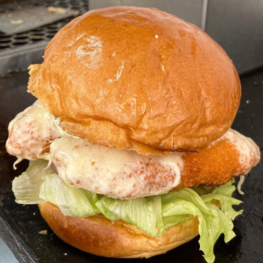 FILÉ DE FRANGO CROCANTE NO PÃO DE BRIOCHE COM MUÇARELA, PICLES, CEBOLA ROXA, ALFACE AMERICANA E MAIONESE VERDE