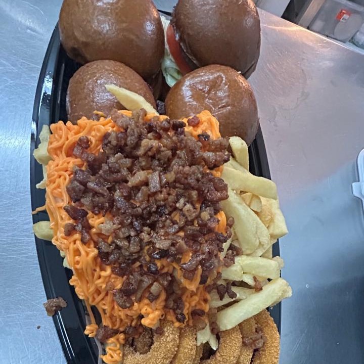 SÃO 4 MINI BURGERS, SENDO 1 XBACON, 1 XSALADA, 1 XONION E 1 XBURGER. FRITAS TRADICIONAL, FRITAS COM CHEDDAR E BACON E ANÉIS DE CEBOLA E 1 MAIONESE VERDE