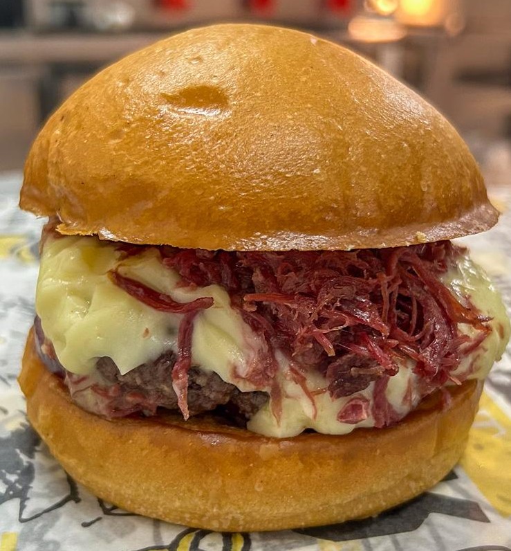 Um burger arretado de bom!Pão brioche, burger tradicional (150 gr), queijo cheddar, deliciosa carne seca desfiada, requeijão cremoso e cebola roxa
